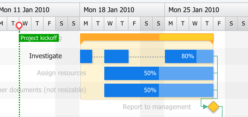 Since the Gantt 3.0 release is getting closer, it’s time to get a bit more familiar with it. Ext Gantt is currently in Beta-1 stage and the next beta is coming soon. In this post we’ll look at how to write a custom plugin which visually groups child task of a parent task. Here’s an image of what it should achieve.